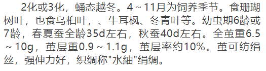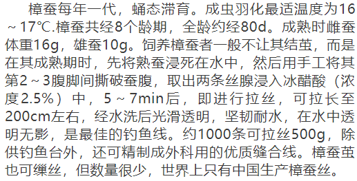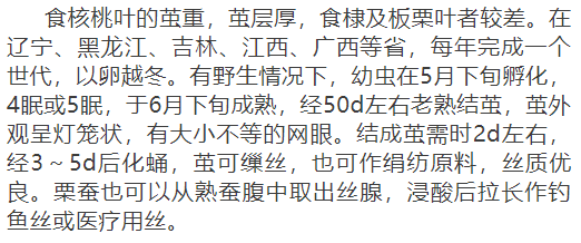 又稱天蠶、楓蠶、漁絲蠶等。樟蠶主要食樟樹葉,絲質較優(yōu),也食楓樹葉、柜柳葉、野薔薇、沙梨、蕃石榴、紫殼木及柯樹葉等,但絲質較差。主要區(qū)是中國、越南、印度等國,產量最多的是中國的海南島。