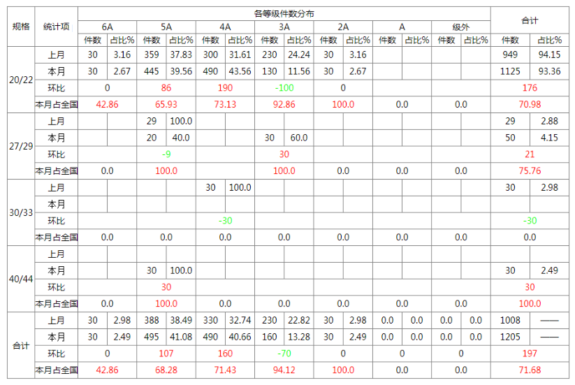 按生絲規(guī)格統(tǒng)計: 20/22規(guī)格1125件,占比93.36%,占全國總量70.98%,環(huán)比增加176件;27/29規(guī)格50件,占比4.15%,占全國總量75.76%,環(huán)比增加21件;30/33規(guī)格本月沒有,環(huán)比減少30件;40/44規(guī)格本月新增30件,占比2.49%,占全國總量100.0%,環(huán)比增加30件。