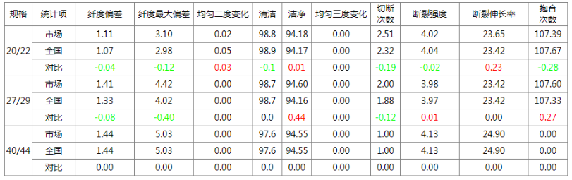 20/22 規(guī)格的產(chǎn)品,本市場生絲超市產(chǎn)品優(yōu)于全國平均水平的指標(biāo)有:斷裂伸長率,與全國平均水平持平的指標(biāo)有:纖度偏差、均勻二度變化、清潔、潔凈、均勻三度變化、斷裂強度、抱合,略低于全國平均水平的指標(biāo)有:纖度最大偏差、切斷。
