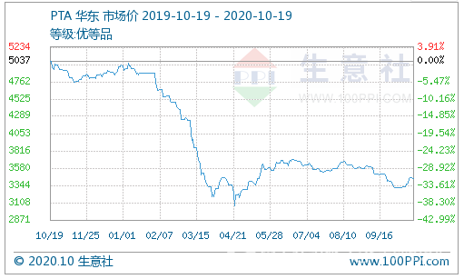 2020年是PTA投產(chǎn)高峰期,產(chǎn)能大幅增加,今年以來包括中泰化學(xué)120萬噸及恒力石化4期250萬噸和5期250萬噸總合計620萬噸裝置已投放到市場,加上今日獨山能源投產(chǎn)的220萬噸,截止目前國內(nèi)PTA產(chǎn)能達到6105.5萬噸。預(yù)計四季度福建百宏250萬噸裝置將于10月份投產(chǎn),中金石化330萬噸裝置計劃年底附近投產(chǎn),倘若裝置投產(chǎn)順利,屆時產(chǎn)能或?qū)⑦_到6685.5萬噸,產(chǎn)能大幅度提升對于國內(nèi)PTA供給壓力進一步增加,供應(yīng)過剩的格局仍較嚴峻,對市場價格帶來打壓。根據(jù)生意社價格監(jiān)測顯示,截止2020年10月19日國內(nèi)PTA現(xiàn)貨市場均價3442元/噸,同比下跌31.67%。