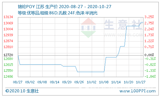 據(jù)生意社數(shù)據(jù)統(tǒng)計(jì),截止到10月27日,江蘇地區(qū)錦綸長(zhǎng)絲DTY報(bào)15466元/噸,較10月1日上漲4.74%,同比下跌13.27%;錦綸POY價(jià)格報(bào)13080元/噸,較10月1日價(jià)格上漲4.31%,同比下跌15.72%;錦綸FDY價(jià)格報(bào)16250元/噸,較10月1日價(jià)格上漲4.17%,同比下跌17.51%。