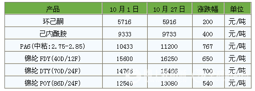 10月份,訂單好轉(zhuǎn),錦綸產(chǎn)業(yè)鏈高價(jià)難降溫。截止27日,純苯均價(jià)為3600元/噸,當(dāng)月漲幅為6.51%,但10月底初步顯現(xiàn)回調(diào)跡象。環(huán)己酮方面,價(jià)格雖有上漲,但漲幅一般。一方面原料端價(jià)格支撐尚可,下游己內(nèi)酰胺成交同樣火熱,可己內(nèi)酰胺多企業(yè)檢修或降負(fù),供應(yīng)量縮減,對(duì)環(huán)己酮上漲有一定的拖累。隨著補(bǔ)貨高峰期的散去,PA6高速紡切片銷(xiāo)售出現(xiàn)壓力,10月雙節(jié)后復(fù)工后短纖、包紗企業(yè)補(bǔ)貨較為積極,這種場(chǎng)景未能持續(xù)太久。近期交投趨勢(shì)轉(zhuǎn)弱,個(gè)別商家下調(diào)報(bào)價(jià)。