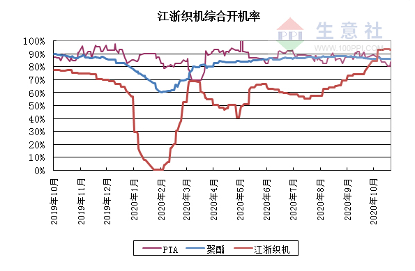 下游方面,因冷冬預(yù)期加上內(nèi)銷采購商為“雙11”備貨的利好預(yù)期,國內(nèi)中國輕紡城傳統(tǒng)市場的冬季防寒面料走貨較多,對應(yīng)需求冬季面料的增多,帶動上游相應(yīng)原料一定銷量,下游織造工廠也在臨近雙十一節(jié)點(diǎn)加足馬力,日夜全力備貨,當(dāng)前江浙織機(jī)綜合開機(jī)率維持在93%以上,目前工廠訂單多維持到11月上旬附近。但據(jù)盛澤地區(qū)消息,目前面料市場成交增速有所放緩,廠家雖然手頭多有訂單執(zhí)行,但是去庫存速度走緩?,F(xiàn)盛澤地區(qū)庫存在40天左右,開機(jī)率繼續(xù)維持在8-9成的高位,同時外貿(mào)市場回暖不如預(yù)期,市場信心也稍有回落,紡企也存在一定顧慮,因此對原料采購采取觀市氣氛較濃、按單生產(chǎn)的經(jīng)營策略。