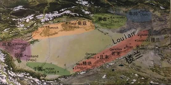 羅布腹地的樓蘭工作站如果我們把時光倒流到2000多年前的漢代,也就是漢武帝和司馬遷所處的那個年代,羅布泊并不是現(xiàn)在這種死氣沉沉、荒無人煙的樣子,那時候羅布泊的氣候和環(huán)境比現(xiàn)在好多了,河流縱橫,綠樹成蔭,非常適宜人類居住,呈現(xiàn)出另一種生機勃勃、人丁興旺的綠洲模樣。大家如果翻看中國地圖,就會發(fā)現(xiàn)新疆是一個非常廣袤非常特殊的所在,簡單地概括新疆的地貌特征就是“三山夾兩盆”——三山是北邊的阿勒泰山、中間的天山、南邊的昆侖山,兩盆是指北邊的準(zhǔn)噶爾盆地、南邊的塔里木盆地。高聳的雪山和低洼的盆地相間排列,每到夏天,天山和昆侖山的雪水融化,流向低洼的塔里木盆地,一路形成大大小小的河流,滋養(yǎng)著大大小小的綠洲,這就是絲綢之路沿線特有沙漠的綠洲文明。水是生命的源泉,也是文明的搖籃??v觀世界文明史,可以發(fā)現(xiàn)著名的古代文明都是伴水而居,如黃河和長江孕育古代中國文明,尼羅河孕育古代埃及文明,幼發(fā)拉底河和底格里斯河孕育古代巴比倫文明,恒河和印度河孕育古代印度文明。新疆雖然沒有大江大河,但有千年積雪的天山和昆侖山,積雪和冰川就像一個個巨大的水塔,冬天儲水,夏天融化,形成一條條河流,滋養(yǎng)著塔里木盆地周邊的一個個綠洲。當(dāng)時一個綠洲就是一個國家,城市的名稱也就是國家的名稱。這些綠洲國家有大有小,數(shù)量眾多,史稱“西域三十六國”,大家在《盜墓筆記》、《鬼吹燈》等懸疑小說中經(jīng)??吹降木^、龜茲、于闐、疏勒,都是西域三十六國的名字。大家看這張西域三十六國的疆域圖,可以發(fā)現(xiàn)樓蘭在全盛時期的勢力范圍非常廣,基本覆蓋了塔里木盆地東部的地盤,是名副其實的西域強國。