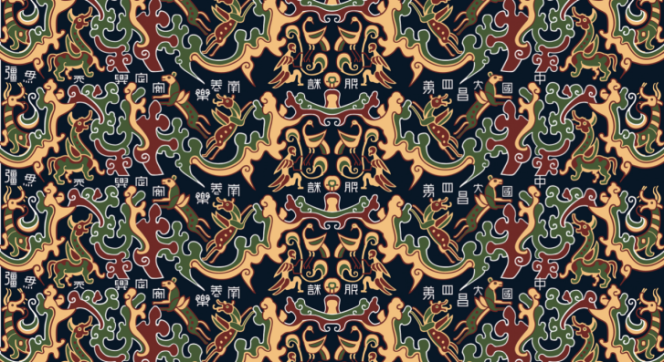 王侯合昏千秋萬歲宜子孫再看這件織錦的紋樣復(fù)原圖,同樣也有各類變形的云氣紋,云氣繞繚中還有一些神奇的動物,是諸如麒麟、白虎之類的神獸,身上還長著一對小小的翅膀。其中的漢字寓意依然很高大上——中國大昌四夷服誅南羌樂安定與天無疆,表示對中原政府繁榮昌盛、四海安定的祝福與祈愿。