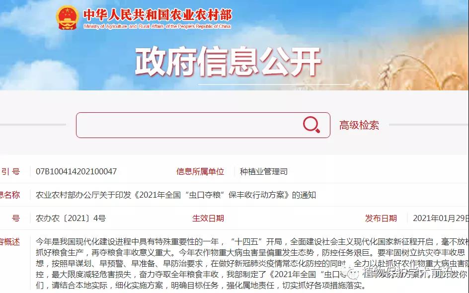 五、保障措施(一)強(qiáng)化責(zé)任落實(shí)。將重大病蟲(chóng)害防控納入糧食安全黨政同責(zé)考核內(nèi)容,按照《農(nóng)作物病蟲(chóng)害防治條例》規(guī)定,落實(shí)部門(mén)指導(dǎo)、省負(fù)總責(zé)、縣抓落實(shí)責(zé)任機(jī)制,層層壓實(shí)防控責(zé)任,細(xì)化工作措施,及早安排部署,強(qiáng)化督導(dǎo)檢查,確?!跋x(chóng)口奪糧”保豐收行動(dòng)順利開(kāi)展。 (二)強(qiáng)化指導(dǎo)服務(wù)。及時(shí)印發(fā)糧食作物重大病蟲(chóng)害防控方案和指導(dǎo)意見(jiàn),層層建立分片包干責(zé)任制,防控關(guān)鍵時(shí)期組派精干力量深入生產(chǎn)一線(xiàn),舉辦現(xiàn)場(chǎng)培訓(xùn),面對(duì)面、手把手指導(dǎo)農(nóng)民開(kāi)展防治,確保防控技術(shù)落到實(shí)處。 (三)強(qiáng)化資金支持。根據(jù)糧食作物重大病蟲(chóng)害發(fā)生和防控需要,農(nóng)業(yè)農(nóng)村部會(huì)同財(cái)政部安排農(nóng)業(yè)生產(chǎn)救災(zāi)資金,支持各地開(kāi)展相關(guān)監(jiān)測(cè)和防控工作。各地在管好用好中央財(cái)政資金的同時(shí),增加地方財(cái)政投入,確保監(jiān)測(cè)防控措施落實(shí)到位。(四)強(qiáng)化宣傳引導(dǎo)。加強(qiáng)信息報(bào)送,做到對(duì)上有信息、對(duì)外有聲音、對(duì)下有通報(bào)。充分利用電視、廣播、報(bào)刊、網(wǎng)絡(luò)、微信公眾號(hào)等宣傳媒體,大力宣傳各地好經(jīng)驗(yàn)、好做法、好典型,為工作推進(jìn)營(yíng)造良好的輿論氛圍。
