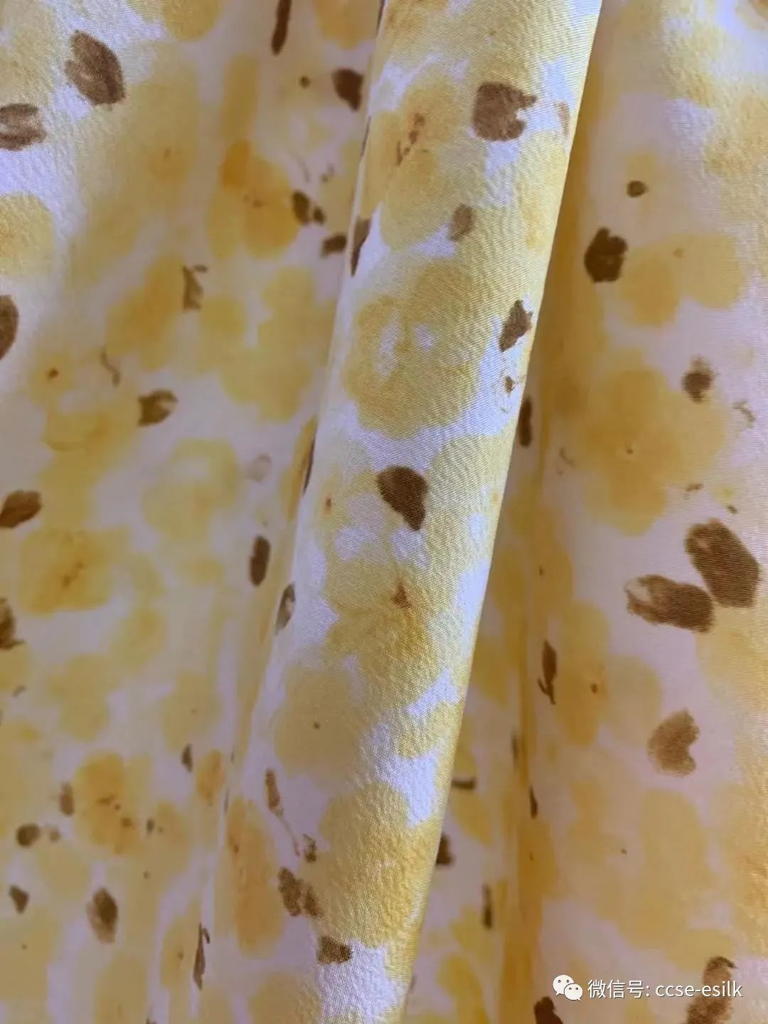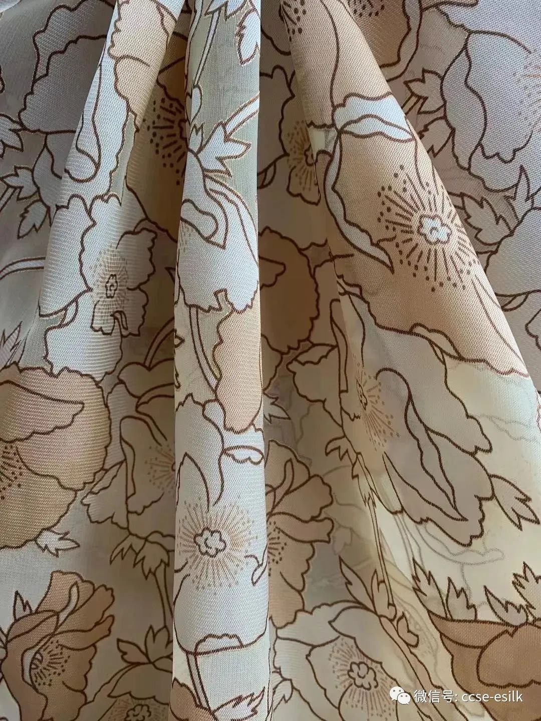 印花此產(chǎn)品經(jīng)緯紗是由真絲、醋酸和滌綸組成,這個產(chǎn)品是在原有的絲醋產(chǎn)品中增加了一根滌綸單絲,能使面料的強(qiáng)力更加好,不易撕破。真絲醋酸的組合不容易起皺也不容易發(fā)硬,它的穩(wěn)定性非常出色。