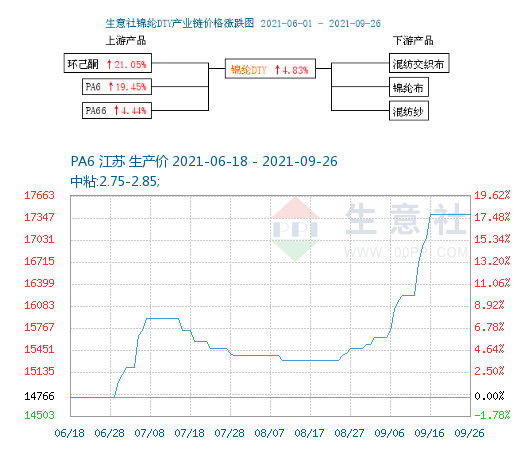 PA6是錦綸民用絲的主要原料,截止9月26日PA6國(guó)內(nèi)市場(chǎng)行情高位平穩(wěn)。樣本企業(yè)對(duì)PA6中粘2.75-2.85的主流報(bào)盤價(jià)在17400元/噸左右,與上周價(jià)格持平。成本端己內(nèi)酰胺對(duì)PA6支撐較強(qiáng),PA6現(xiàn)貨價(jià)格區(qū)間高位持穩(wěn)。下游企業(yè)需求一般,場(chǎng)內(nèi)交投表現(xiàn)尚可。國(guó)內(nèi)總體庫(kù)存小幅上升,但行業(yè)開工率總體低位,預(yù)計(jì)短期內(nèi)PA6現(xiàn)貨價(jià)格或?qū)⒏呶徽磉\(yùn)行?! ?/div>