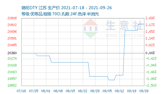 據(jù)生意社數(shù)據(jù)統(tǒng)計(jì)顯示,9月中旬錦綸市場(chǎng)受原料行情影響,錦綸價(jià)格大漲,上周(9月20-26日)錦綸現(xiàn)貨價(jià)格穩(wěn)中有升,行情高位持堅(jiān)。截止9月26日,江蘇地區(qū)錦綸長(zhǎng)絲DTY(優(yōu)等品;70D/24F)報(bào)價(jià)20820元/噸,較上周價(jià)格上漲100元/噸;錦綸POY(優(yōu)等品;86D/24F)報(bào)價(jià)18325元/噸,與上周價(jià)格持平;錦綸FDY(優(yōu)等品:40D/12F)價(jià)格報(bào)22166元/噸,較上周價(jià)格上漲166元/噸。