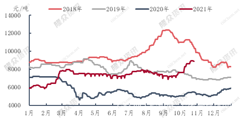 圖1 2018-2021年國內(nèi)滌綸長絲價格走勢對比