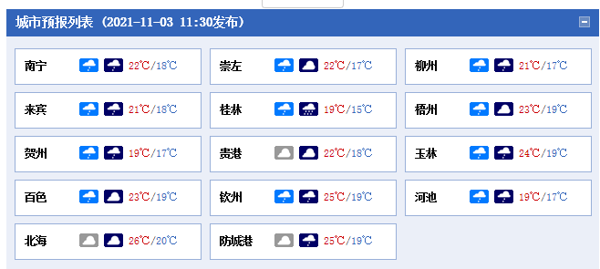 今天白天,桂林、柳州、河池、來賓等市的部分地區(qū)有小到中雨,局部大雨,我區(qū)其它地區(qū)陰天有小雨。