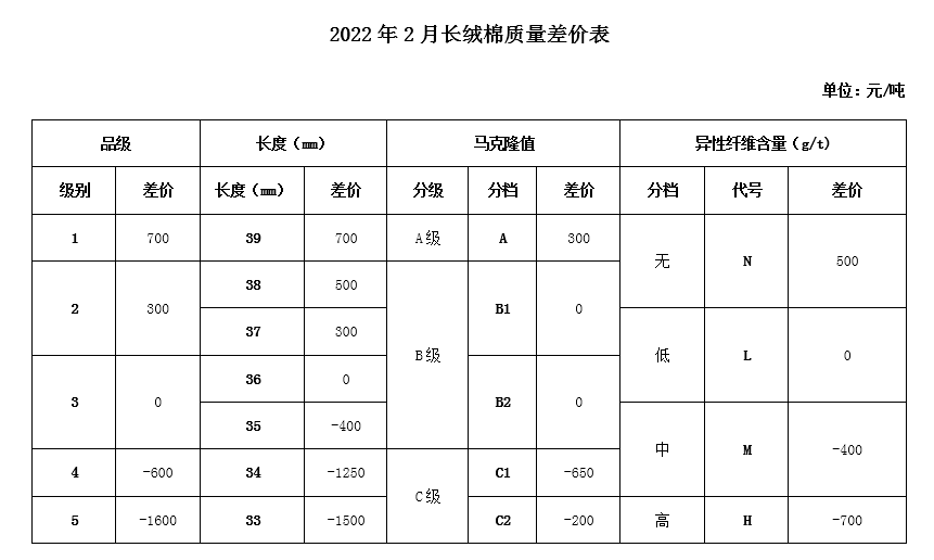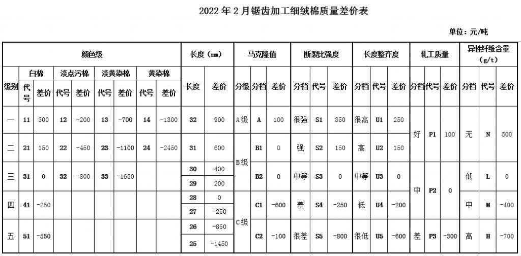 根據(jù)《中國棉花協(xié)會國產棉質量差價表管理辦法》規(guī)定,現(xiàn)正式發(fā)布2022年2月《鋸齒加工細絨棉質量差價表》、《皮輥加工細絨棉質量差價表》和《長絨棉質量差價表》(單位:元/噸)。
