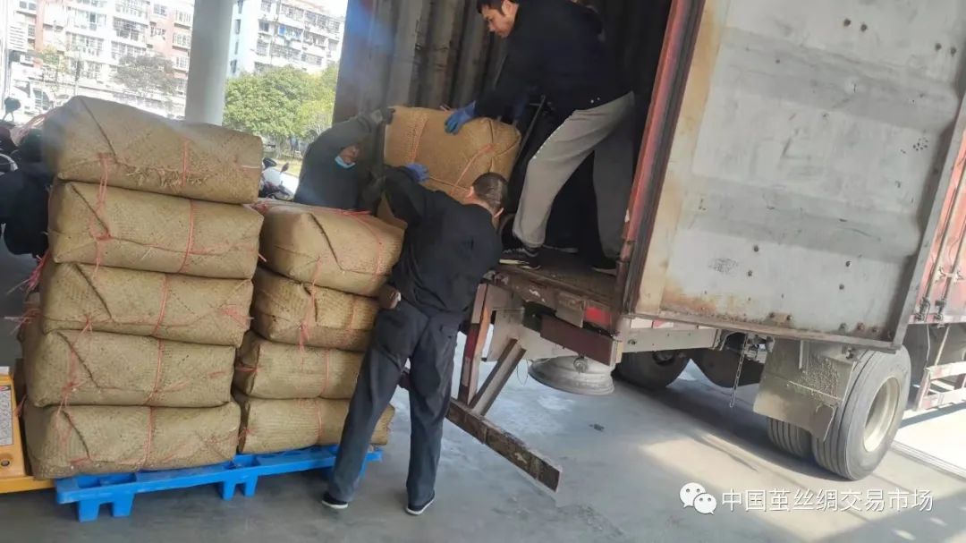 近日,向印度方向生絲出口較為忙碌。下圖為本周中國繭絲綢交易嘉興本部二期大樓的生絲出口打包出貨現(xiàn)場。