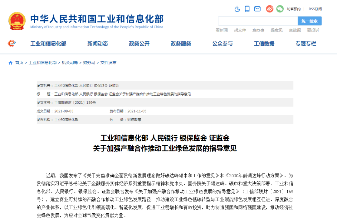 為貫徹落實(shí)習(xí)近平總書(shū)記關(guān)于金融服務(wù)實(shí)體經(jīng)濟(jì)系列重要指示精神和黨中央、國(guó)務(wù)院關(guān)于碳達(dá)峰、碳中和重大決策部署,工業(yè)和信息化部、人民銀行、銀保監(jiān)會(huì)、證監(jiān)會(huì)聯(lián)合發(fā)布《關(guān)于加強(qiáng)產(chǎn)融合作推動(dòng)工業(yè)綠色發(fā)展的指導(dǎo)意見(jiàn)》(工信部聯(lián)財(cái)〔2021〕159號(hào)),建立商業(yè)可持續(xù)的產(chǎn)融合作推動(dòng)工業(yè)綠色發(fā)展路徑,推動(dòng)建設(shè)工業(yè)綠色低碳轉(zhuǎn)型與工業(yè)賦能綠色發(fā)展相互促進(jìn)、深度融合的產(chǎn)業(yè)體系,以工業(yè)綠色化引領(lǐng)高端化、智能化發(fā)展,促進(jìn)工業(yè)穩(wěn)增長(zhǎng)和有效投資,助力制造強(qiáng)國(guó)和網(wǎng)絡(luò)強(qiáng)國(guó)建設(shè),推動(dòng)經(jīng)濟(jì)社會(huì)綠色發(fā)展,為應(yīng)對(duì)全球氣候變化貢獻(xiàn)力量。