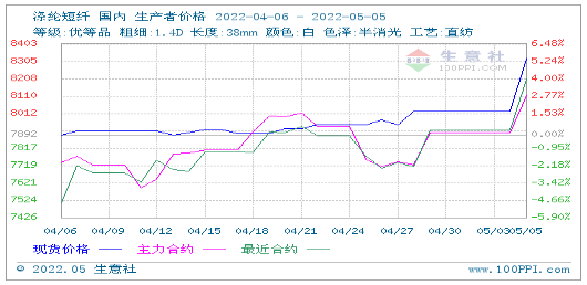 據(jù)生意社價(jià)格監(jiān)測(cè)顯示,5月5日國(guó)內(nèi)滌綸短纖現(xiàn)貨市場(chǎng)報(bào)價(jià)均價(jià)為8322元/噸,較上一交易日上漲3.70%,同比上漲19.86%。5月5日國(guó)內(nèi)短纖期貨主力合約早盤收于8104,較前一交易日結(jié)算價(jià)上漲2.50%,今日結(jié)算價(jià)為8092。短纖原料期貨今日收盤均上漲,PTA主力漲2.27%,乙二醇主力漲2.83%。