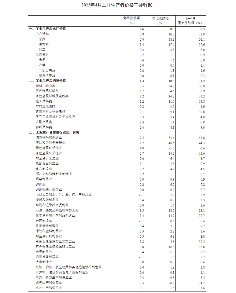 2022年4月份工業(yè)生產者出廠價格同比上漲8.0% 環(huán)比上漲0.6%