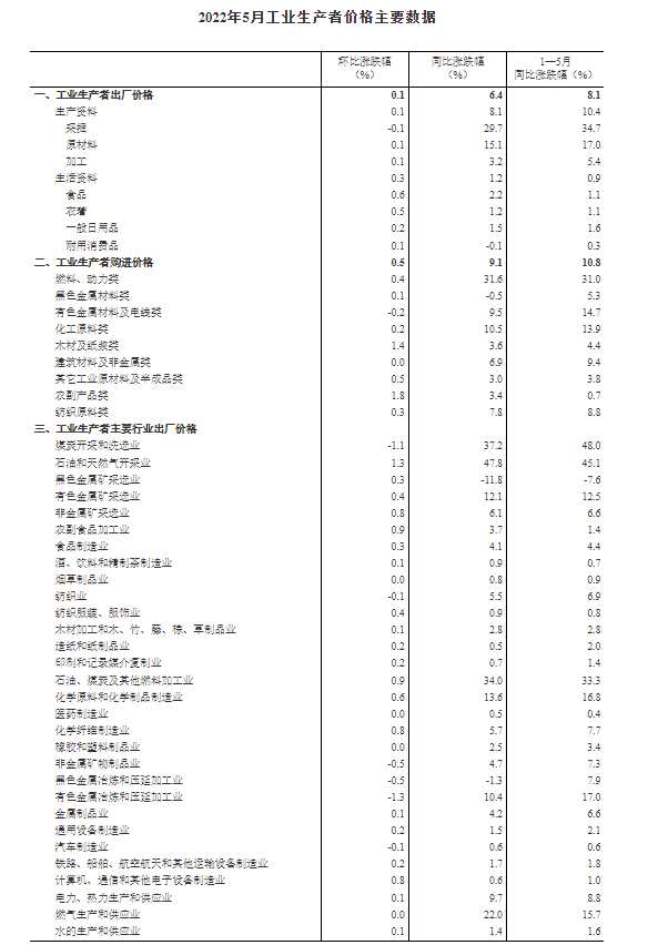 2022年5月份,全國(guó)工業(yè)生產(chǎn)者出廠價(jià)格同比上漲6.4%,環(huán)比上漲0.1%;工業(yè)生產(chǎn)者購進(jìn)價(jià)格同比上漲9.1%,環(huán)比上漲0.5%。1—5月平均,工業(yè)生產(chǎn)者出廠價(jià)格比去年同期上漲8.1%,工業(yè)生產(chǎn)者購進(jìn)價(jià)格上漲10.8%。