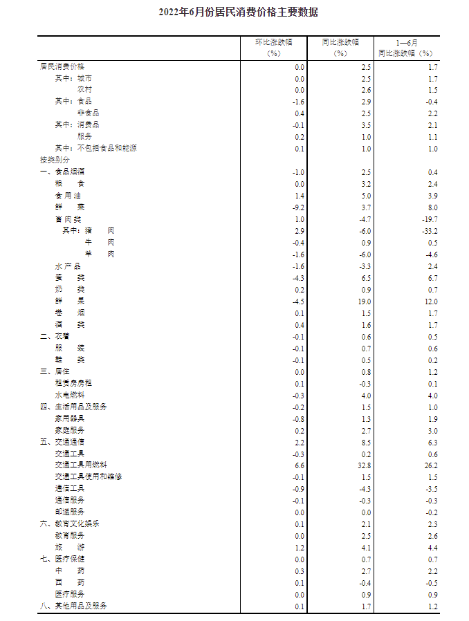 2022年6月份,全國居民消費(fèi)價(jià)格同比上漲2.5%。其中,城市上漲2.5%,農(nóng)村上漲2.6%;食品價(jià)格上漲2.9%,非食品價(jià)格上漲2.5%;消費(fèi)品價(jià)格上漲3.5%,服務(wù)價(jià)格上漲1.0%。1--—6月平均,全國居民消費(fèi)價(jià)格比上年同期上漲1.7%。