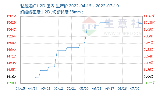 根據(jù)生意社價(jià)格監(jiān)測(cè),截止至2022年7月10日,1.2D*38mm粘膠短纖國(guó)內(nèi)地區(qū)出廠報(bào)價(jià)為15620元/噸,價(jià)格穩(wěn)中有降,較上周價(jià)格下跌40元/噸,跌幅0.26%。人棉紗價(jià)格處高位穩(wěn)定,(30S,環(huán)錠紡,一等品)出廠均價(jià)為19233元/噸。