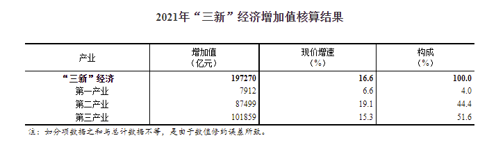 經(jīng)核算,2021年我國“三新”經(jīng)濟(jì)增加值為197270億元,比上年增長16.6%(未扣除價(jià)格因素,下同),比同期國內(nèi)生產(chǎn)總值(GDP)現(xiàn)價(jià)增速高3.8個(gè)百分點(diǎn);相當(dāng)于GDP的比重為17.25%,比上年提高0.17個(gè)百分點(diǎn)。
