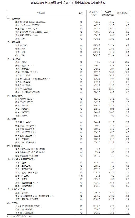 2022年8月上旬流通領(lǐng)域重要生產(chǎn)資料市場價格變動情況