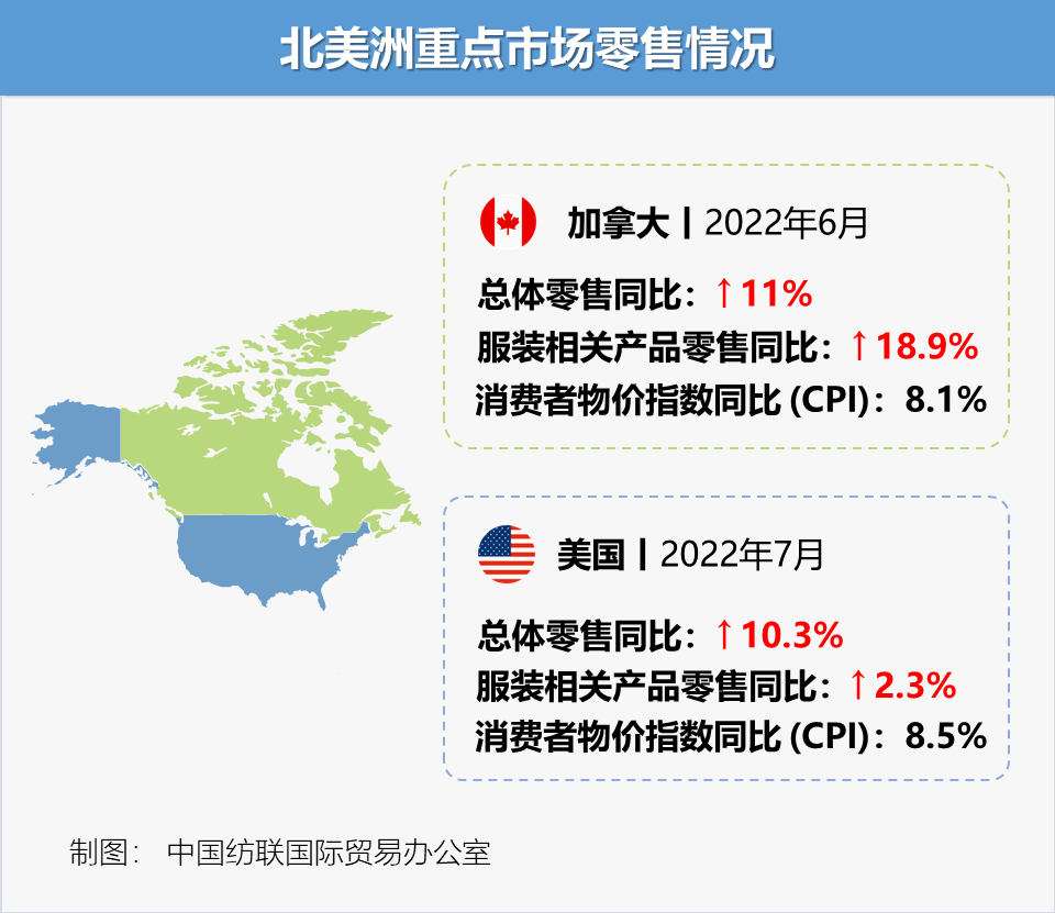 6月,加拿大通脹加速升溫,CPI同比增長(zhǎng)8.1%。同月,加拿大零售總額同比增加11%;服裝類用品銷售額為26.1億加元(約20.1億美元),去年低基數(shù)效應(yīng)下同比增長(zhǎng)18.9%,環(huán)比增長(zhǎng)3.8%。