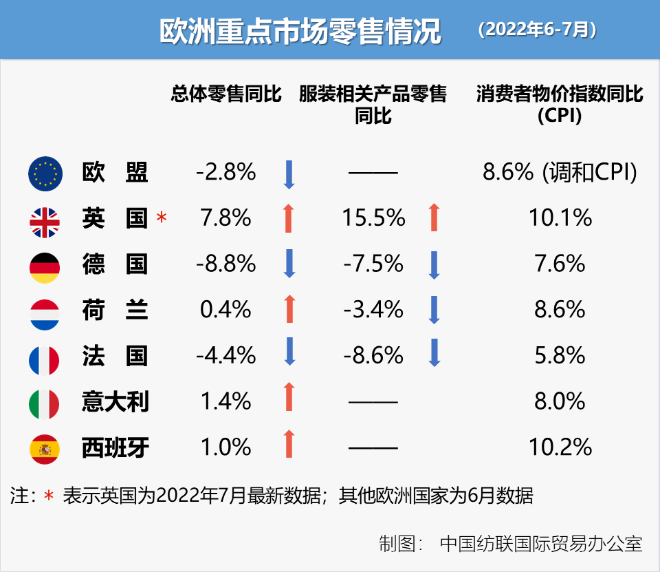 今年6月,歐盟27國(guó)零售總額同比下滑2.8%,自去年2月以來(lái)首次出現(xiàn)負(fù)增長(zhǎng)。能源價(jià)格高企積壓下,歐洲紡織品服裝類產(chǎn)品消費(fèi)持續(xù)低迷,多個(gè)重點(diǎn)國(guó)家服裝零售增速由正轉(zhuǎn)負(fù)。