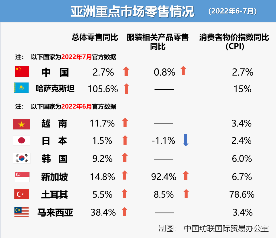 受俄烏戰(zhàn)爭(zhēng)和相關(guān)制裁導(dǎo)致的全球食品和燃料價(jià)格上漲影響,6至7月,亞洲多個(gè)國(guó)家通脹壓力加劇,服裝類產(chǎn)品零售增速放緩。
