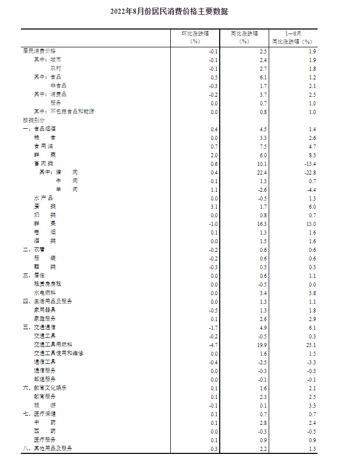 2022年8月份,全國居民消費價格同比上漲2.5%。其中,城市上漲2.4%,農(nóng)村上漲2.7%;食品價格上漲6.1%,非食品價格上漲1.7%;消費品價格上漲3.7%,服務(wù)價格上漲0.7%。1--—8月平均,全國居民消費價格比上年同期上漲1.9%。