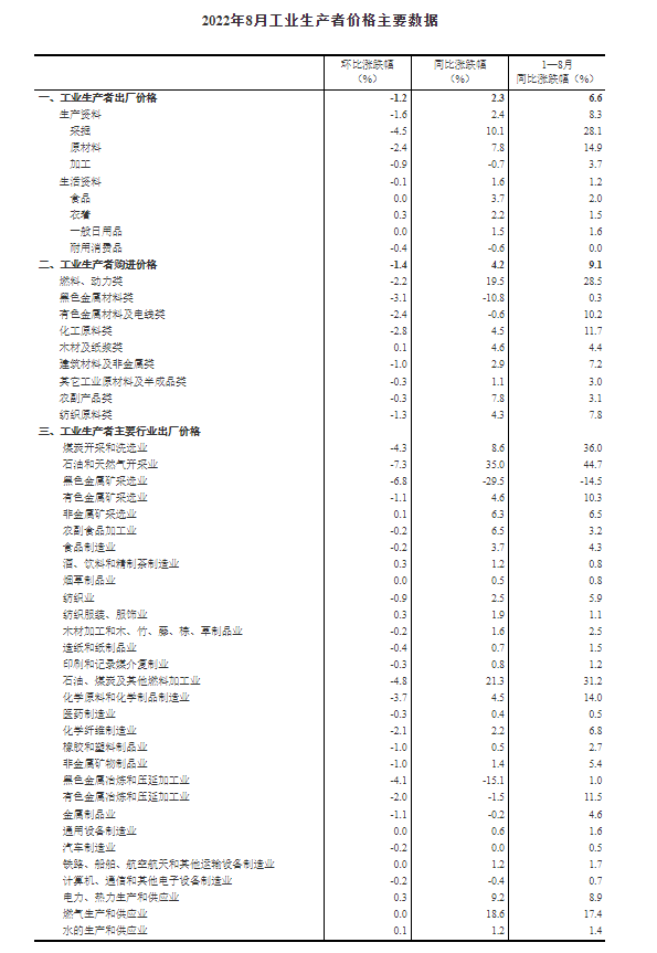 2022年8月份,全國工業(yè)生產(chǎn)者出廠價格同比上漲2.3%,環(huán)比下降1.2%;工業(yè)生產(chǎn)者購進價格同比上漲4.2%,環(huán)比下降1.4%。1—8月平均,工業(yè)生產(chǎn)者出廠價格比去年同期上漲6.6%,工業(yè)生產(chǎn)者購進價格上漲9.1%。