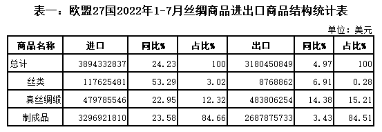 表一:歐盟27國(guó)2022年1-7月絲綢商品進(jìn)出口商品結(jié)構(gòu)統(tǒng)計(jì)表