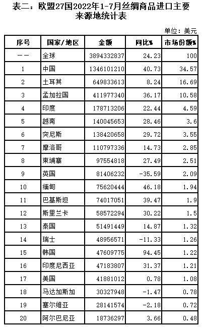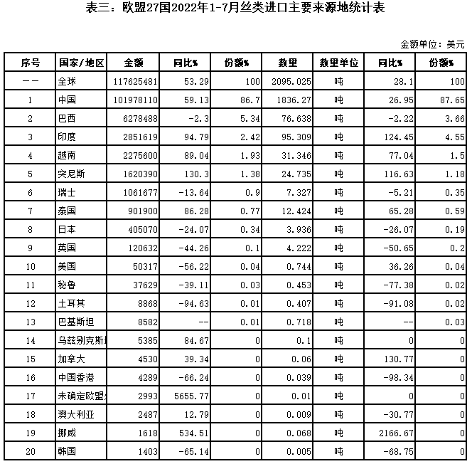 表三:歐盟27國(guó)2022年1-7月絲類進(jìn)口主要來源地統(tǒng)計(jì)表