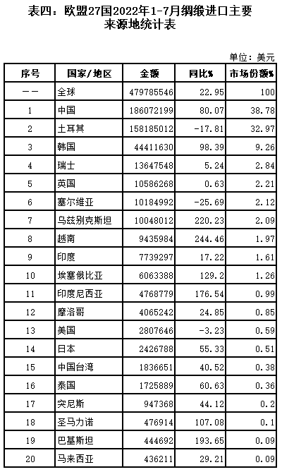表四:歐盟27國(guó)2022年1-7月綢緞進(jìn)口主要來源地統(tǒng)計(jì)表