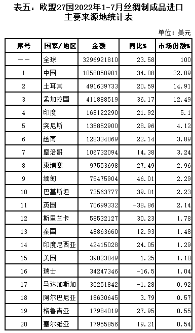 表五:歐盟27國(guó)2022年1-7月絲綢制成品進(jìn)口主要來源地統(tǒng)計(jì)表