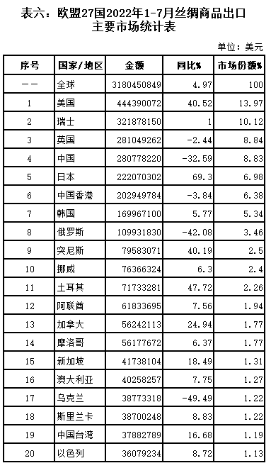表六:歐盟27國(guó)2022年1-7月絲綢商品出口主要市場(chǎng)統(tǒng)計(jì)表
