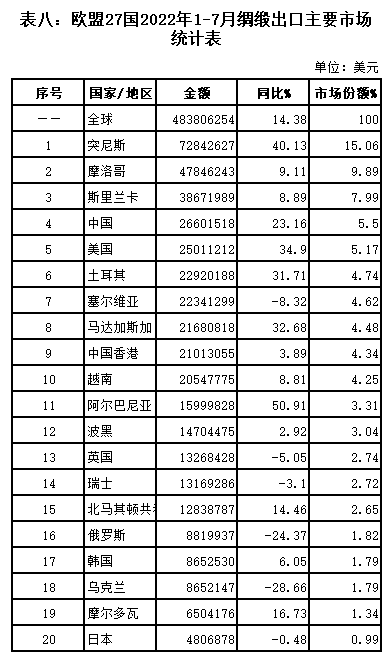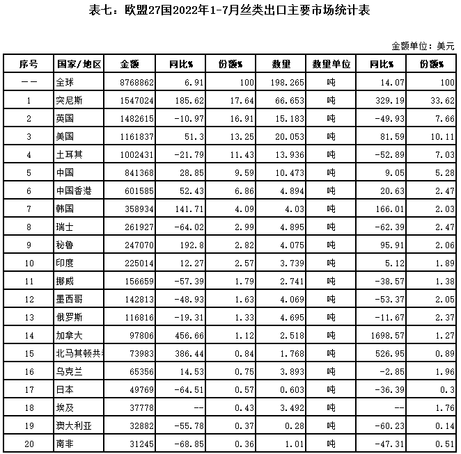 表七:歐盟27國(guó)2022年1-7月絲類出口主要市場(chǎng)統(tǒng)計(jì)表