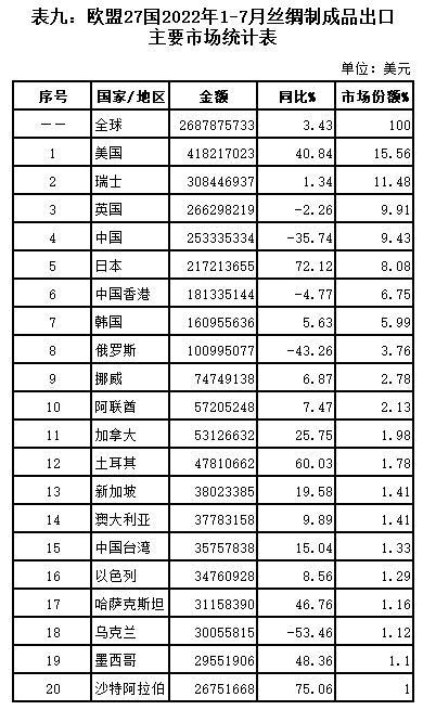 表九:歐盟27國(guó)2022年1-7月絲綢制成品出口主要市場(chǎng)統(tǒng)計(jì)表