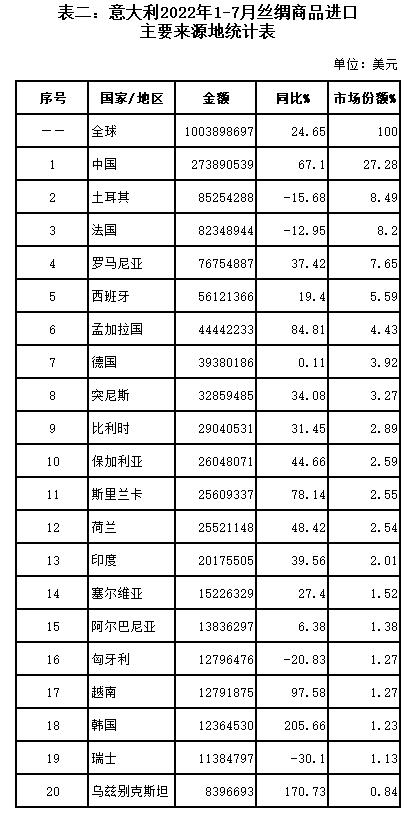 表二:意大利2022年1-7月絲綢商品進(jìn)口主要來(lái)源地統(tǒng)計(jì)表