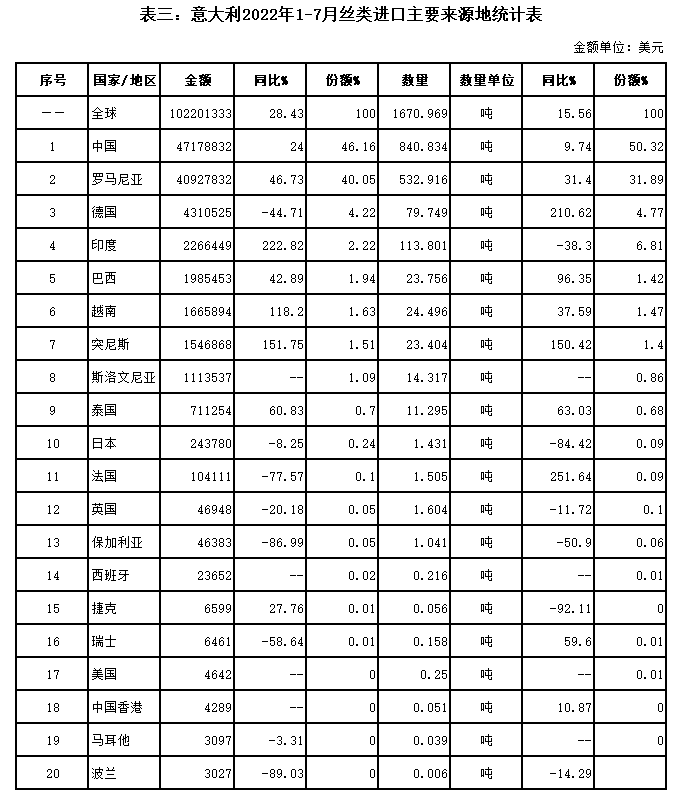 表三:意大利2022年1-7月絲類(lèi)進(jìn)口主要來(lái)源地統(tǒng)計(jì)表