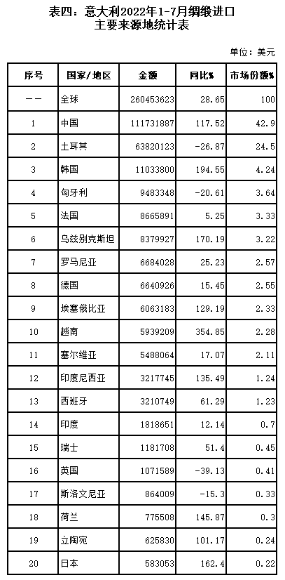表四:意大利2022年1-7月綢緞進(jìn)口主要來(lái)源地統(tǒng)計(jì)表