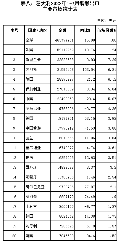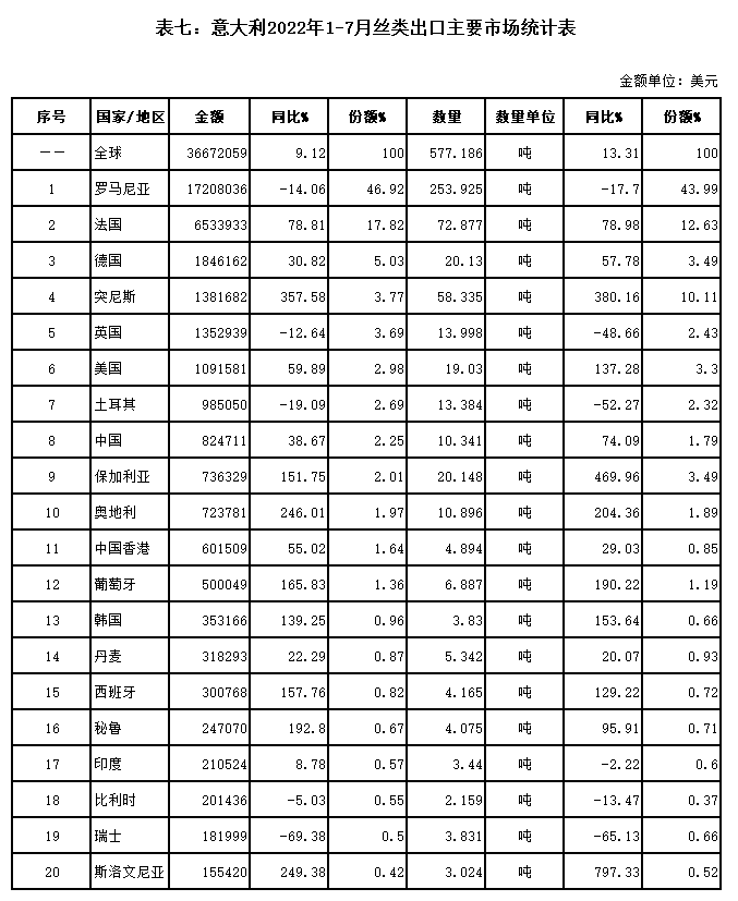 表七:意大利2022年1-7月絲類(lèi)出口主要市場(chǎng)統(tǒng)計(jì)表