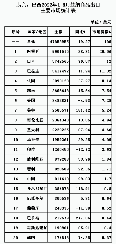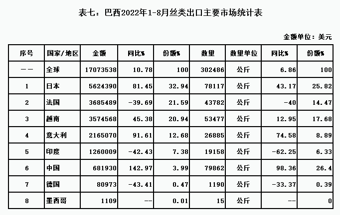 表七:巴西2022年1-8月絲類出口主要市場(chǎng)統(tǒng)計(jì)表