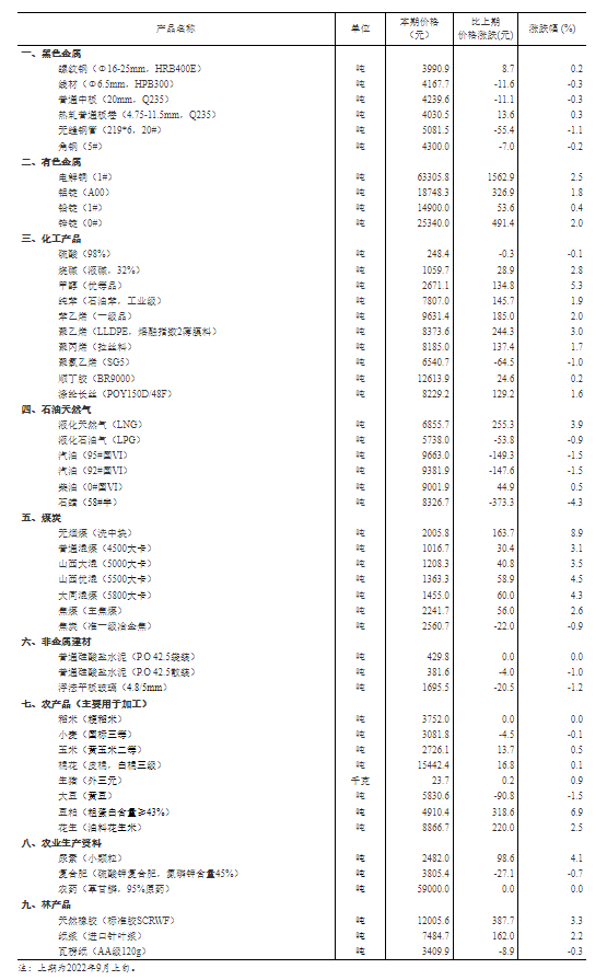 2022年9月中旬流通領(lǐng)域重要生產(chǎn)資料市場價(jià)格變動(dòng)情況