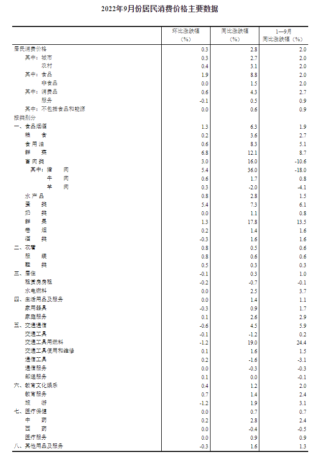 9月份,全國居民消費價格環(huán)比上漲0.3%。其中,城市上漲0.3%,農(nóng)村上漲0.4%;食品價格上漲1.9%,非食品價格持平;消費品價格上漲0.6%,服務(wù)價格下降0.1%。