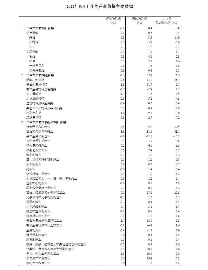 2022年9月份,全國工業(yè)生產(chǎn)者出廠價(jià)格同比上漲0.9%,環(huán)比下降0.1%;工業(yè)生產(chǎn)者購進(jìn)價(jià)格同比上漲2.6%,環(huán)比下降0.5%。1—9月平均,工業(yè)生產(chǎn)者出廠價(jià)格比去年同期上漲5.9%,工業(yè)生產(chǎn)者購進(jìn)價(jià)格上漲8.3%。