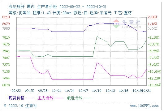 現(xiàn)貨價格:本周(10.17-10.21)國內滌綸短纖現(xiàn)貨行情呈震蕩走低態(tài)勢。據(jù)生意社價格監(jiān)測顯示,10月21日國內滌綸短纖均價報價在7922元/噸左右,較周一下跌1.61%,比去年同期下跌4.73%。