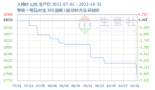 人棉紗價(jià)格跟隨下跌,截止至2022年10月31日(30S,環(huán)錠紡,一等品)出廠均價(jià)為17866元/噸,呈現(xiàn)有價(jià)無(wú)市局面,較月初價(jià)格下跌近300元/噸,月跌幅1.86%。