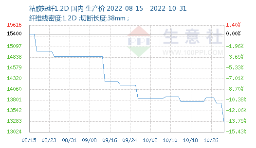 根據(jù)生意社價(jià)格監(jiān)測(cè),10月粘膠短纖價(jià)格先穩(wěn)后跌,截止至2022年10月31日,1.2D*38mm粘膠短纖國(guó)內(nèi)地區(qū)出廠報(bào)價(jià)為13240元/噸,較月初價(jià)格下跌600元/噸,月跌幅4.34%。