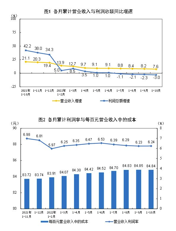 1—10月份,全國規(guī)模以上工業(yè)企業(yè)實(shí)現(xiàn)利潤總額69768.2億元,同比下降3.0%(按可比口徑計算,詳見附注二)。
