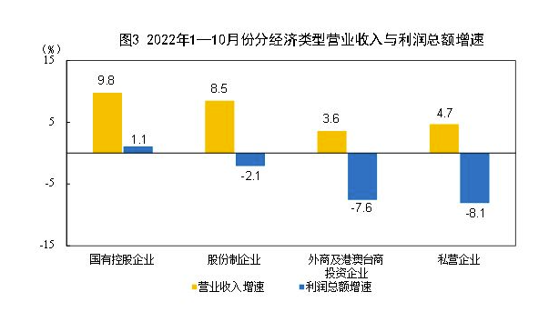 1—10月份,規(guī)模以上工業(yè)企業(yè)中,國有控股企業(yè)實(shí)現(xiàn)利潤總額22648.9億元,同比增長1.1%;股份制企業(yè)實(shí)現(xiàn)利潤總額50877.4億元,下降2.1%;外商及港澳臺商投資企業(yè)實(shí)現(xiàn)利潤總額16617.2億元,下降7.6%;私營企業(yè)實(shí)現(xiàn)利潤總額19641.2億元,下降8.1%。